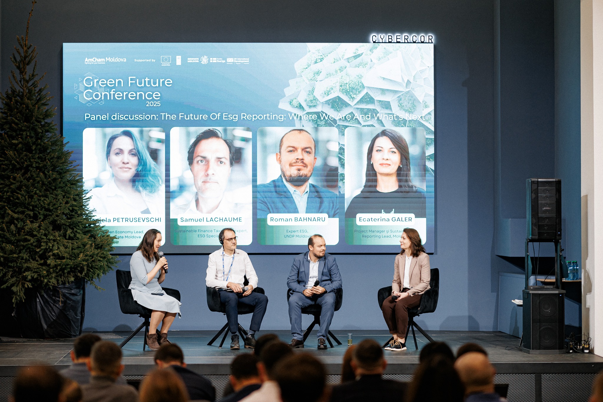 The event agenda included TED Talks–style presentations, a fireside chat on decarbonization, an ESG panel, and discussions on innovation, digitalization, circular economy, European regulations 🇪🇺, and green transition models relevant to the competitiveness of companies in the Republic of Moldova.